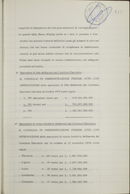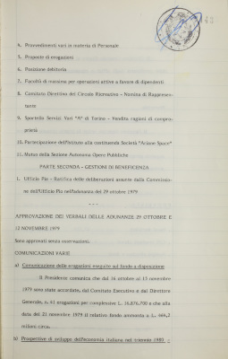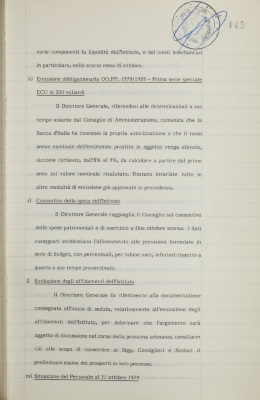 Comunicazioni varie: comunicazione delle erogazioni eseguite sul fondo a disposizione; prospettive di sviluppo dell'economia italiana nel triennio 1980-1982; situazione dei conti al 31 ottobre 1979; operazioni di fido deliberate dal Comitato esecutivo; operazioni di mutuo fondiario deliberate dal Comitato esecutivo; operazioni di mutuo della sezione autonoma opere pubbliche deliberate dal Comitato esecutivo; liquidità dell'Istituto a fine ottobre 1979; emissione obbligazionaria OO:PP. 1979/1989, prima serie speciale Ecu in 200 miliardi; consuntivo della spesa dell'Istituto; evoluzione degli affidamenti dell'Istituto; situazione del personale al 31 ottobre 1979; richiesta di istituzione di una filiale dell'Istituto a Monaco di Baviera; costituzione della Società di Revisione