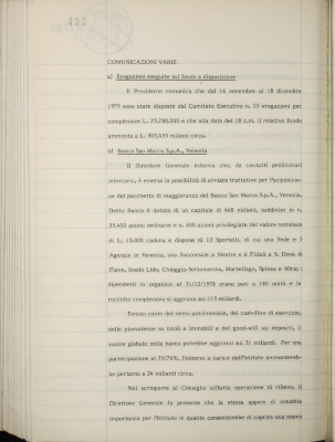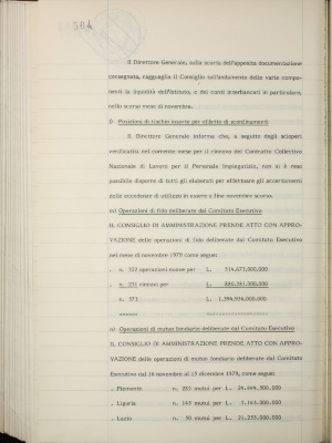 Comunicazioni varie: erogazioni eseguite sul fondo a disposizione; Banco San Marco S.p.A., Venezia; Consorzio bancario Sir; problemi inerenti il gruppo Liquigas, proroga affidamenti a favore delle Società del Gruppo «Pozzi Ginori»; incontro per la definizione delle linee di collaborazione Banco di Sicilia - San Paolo in ordine alla Banca del Sud; costituenda Società di Leasing per il Sud. Conferimento di incarico di direttore a funzionario dell'Istituto; evoluzione degli affidamenti dell'Istituto; prospettive dell'economia per il 1908; liquidità dell'Istituto a fine novembre 1979; posizioni a rischio insorte per effetto di sconfinamenti; operazioni di fido deliberate dal Comitato esecutivo; operazioni di mutuo fondiario deliberate dal Comitato esecutivo; operazioni di mutuo della sezione autonoma opere pubbliche deliberate dal Comitato esecutivo; situazione del personale al 30 novembre 1979