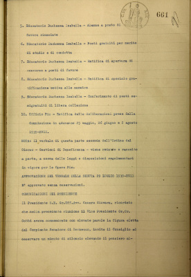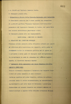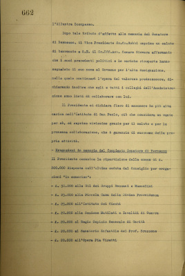 Comunicazioni del Presidente: a) erogazioni in memoria del compianto senatore di Bernezzo; b) erogazione a favore della Biennale Nazionale dell'Autarchia