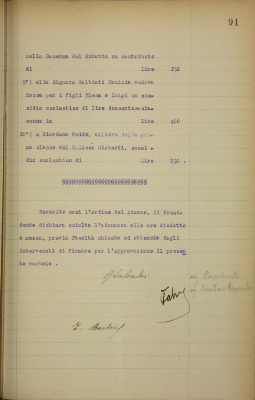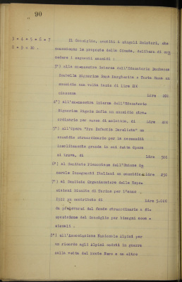 ex maestre interne dell'EDI, Rama Margherita, Torta Emma; ex maestra interna dell'EDI, Rigois Sofia, per malattia; all'Opera Pro Infantia Derelicta; Comitato piemontese dell'Unione Generale Insegnanti Italiani; Comitato Organizzatore delle Esposizioni Riunite in Torino; Associazione Nazionale Alpini per un ricordo degli Alpini caduti in guerra sulle vette del Monte Nero e alla Caserma del Rubatto; Galbiati Erminia, vedova Rocca, per i figli Elena e Luigi, sussidio scolastico; Giordana Guido, allievo del Regio Liceo Gioberti, sussidio scolastico.