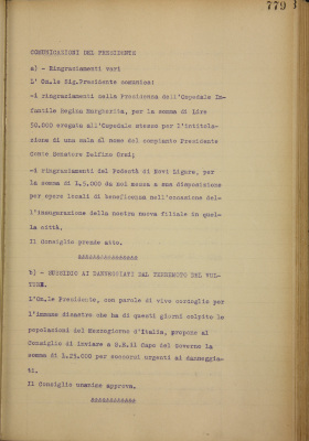 Comunicazioni del Presidente: ringraziamenti vari; sussidio ai danneggiati del terremoto del Vulture; questione ospitaliera di Torino; liquidazione della pratica Frapolli; segreto sugli affari di ufficio; riporto Lisi