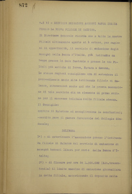 Parte prima - Aziende di Credito 5. Filiale di Saluzzo: a) Autorizzazione della spesa per la sistemazione dei locali b) Assunzione del servizio emissione assegni circolari per conto della Banca d'Italia