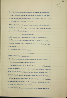 7. Ratifica delle deliberazioni prese dalla Commissione per l'Ufficio Pio nelle sedute del 27 ottobre e 28 novembre 1932