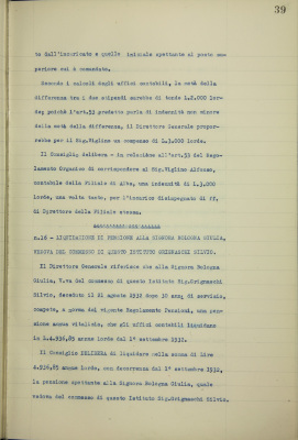 Parte prima - Aziende di Credito 16. Liquidazione di pensione alla sig.ra Bologna Giulia, vedova del commesso di questi Istituto Grignaschi Silvio