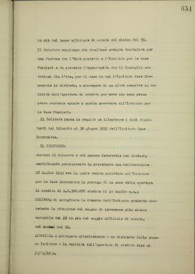 Parte prima - Gestioni di Credito 10. Istituto per le case economiche di Torino. Apertura di credito in conto corrente. Proroga già deliberata. Domanda di riduzione del saggio di interesse