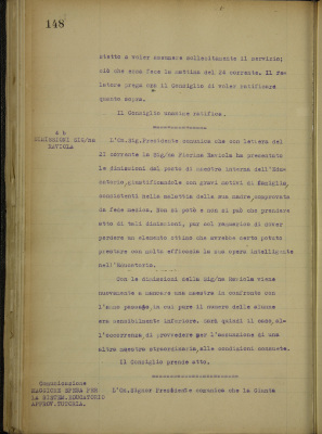 Parte seconda - Aziende di Beneficenza 4. Eventuali e diverse: a) assunzione a maestra interna di Giustetto Maria Pierina b) dimissioni della maestra interna Raviola Fiorina