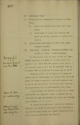 Reimpiego fondi: rinnovo operazione di sconto al comm. Parisi; Buono del tesoro per un milione a scadenza; fabbisogno di cassa per i servizi del monte di pietà, cartelle e cedole fondiarie