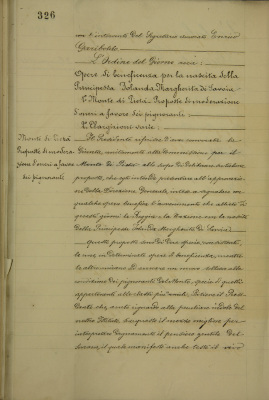Opere di beneficenza per la nascita della principessa Jolanda Margherita di Savoia: Monte di pietà, proposte di moderazione d'oneri a favore dei pignoranti; elargizioni varie