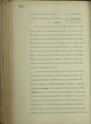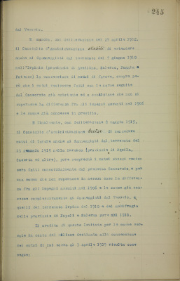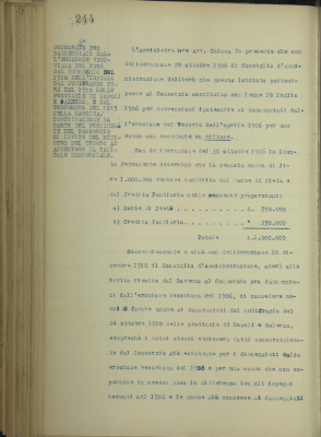 Consorzio pro danneggiati dall'eruzione vesuviana del 1906, dal terremoto dell'Irpinia del 1910, dal nubifragio nelle province di Napoli e Salerno pure del 1910, dal terremoto nella Marsica del 1915. Comunicazione da parte del Presidente Miraglia di invito del Ministero del Tesoro ad aumentare il capitale consorziale