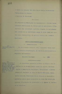 Comunicazioni: a) prestiti sull'onore; b) causa Istituto contro Cantalupo, Bongiovanni e Boeris, pensionati; sentenza del tribunale di Torino 1 luglio 1919; c) EDI. Perizia e preventivo di spesa dei lavori occorrenti al ripristino del fabbricato