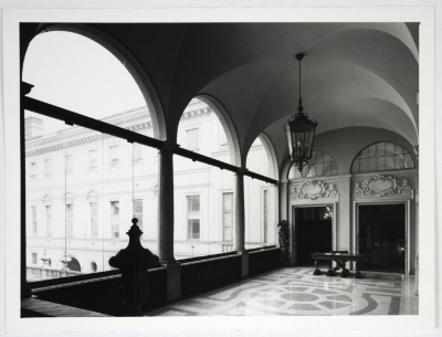 Stabile di piazza San Carlo dopo la ristrutturazione: salone al primo piano con veduta sul cortile