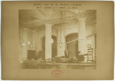 Sala incanti del Monte di Pietà: ritratto di due impiegati in interno