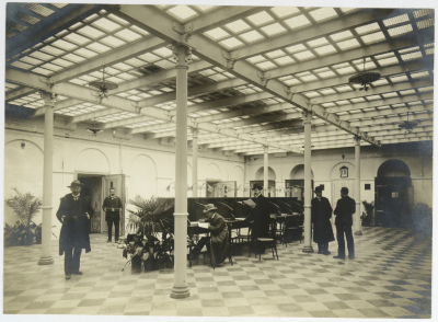 Salone sotterraneo di accesso alle "camere forti", nella sede dell'Istituto in via Monte di Pietà. Veduta animata