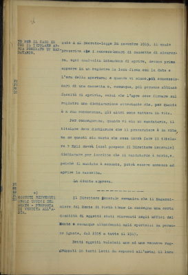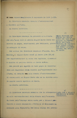 f) pegno ricevuto per errore dal perito Corte nel 1910 e non esposto all'esperimento dell'asta. Proposta di consegna allo stesso perito che versò l'importo del debito al Monte;