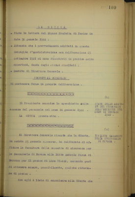 a) deliberazione del Consiglio di amministrazione in data 23 settembre 1921 che modifica gli articoli 129 e 143 dello statuto organico, risposta del Ministero dell'Industria e commercio;