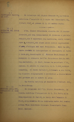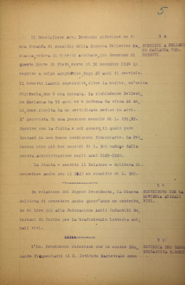 Sussidi: Pellerino Marianna vedova di Gobetti Annibale, ex commesso del Monte; Federazione degli Asili infantili suburbani di Torino per la tradizionale lotteria animali vivi; lotteria pro cassa scolastica del Regio Istituto magistrale D. Berti, ratifica; Comitato per la campana ai caduti nel castello di Rovereto; sottoscrizione per il calendario nazionale 1927
