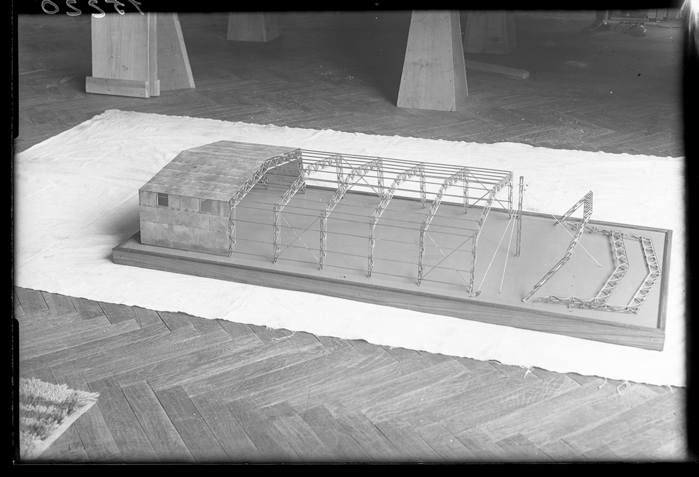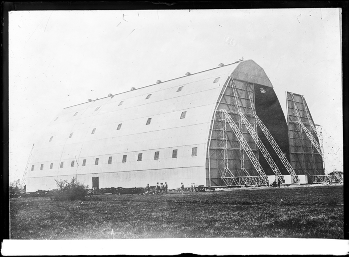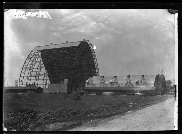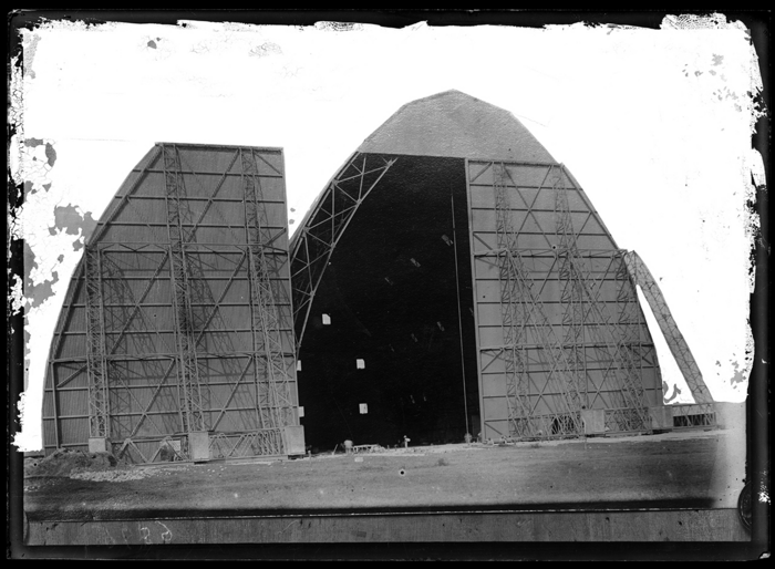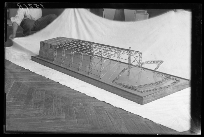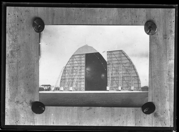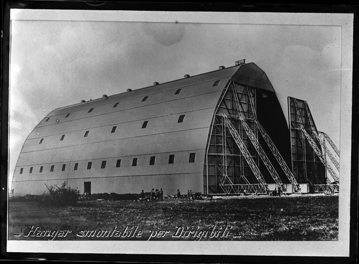 Hangar smontabile per dirigibile: 10 negativi su vetro e foto a contatto. Due immagini riproducono il modello di un hangar.