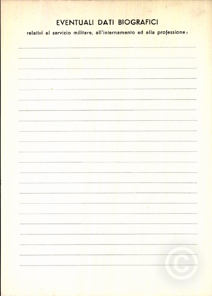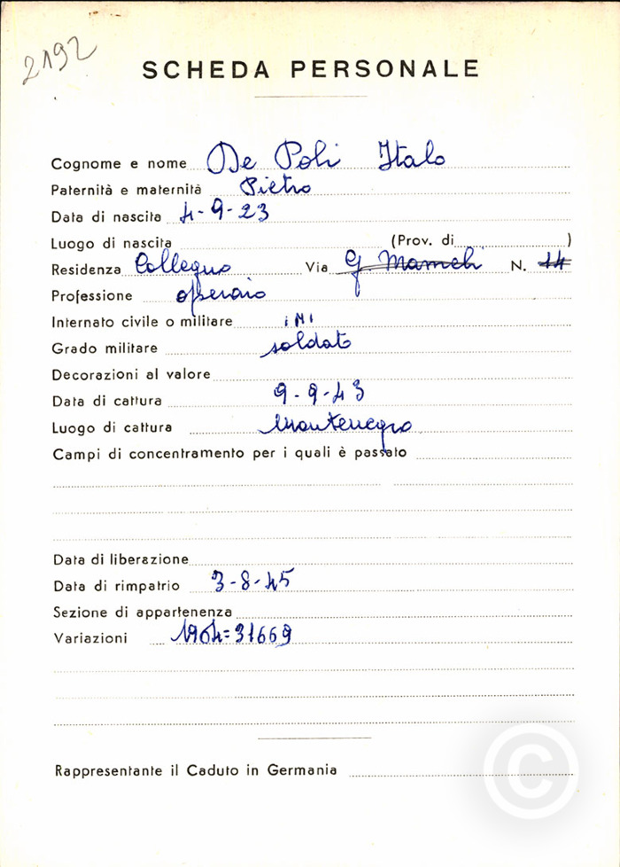 Data di nascita: 04/09/1923 Residenza: Collegno Professione: operaio Luogo di cattura: Montenegro Data di cattura: 09/09/1943 Data di liberazione e data di rimpatrio: 03/08/1945 Liberazione e/o rimpatrio: rimpatrio Internato militare/grado: soldato