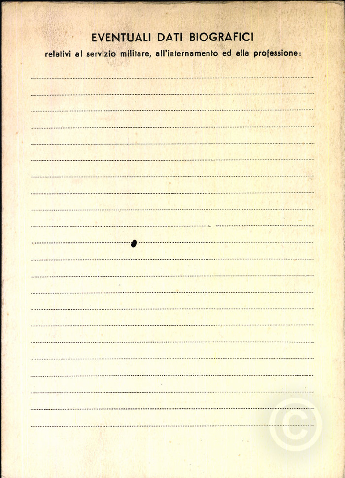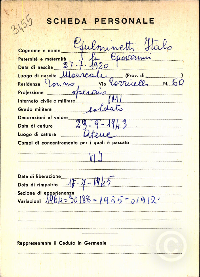 Data di nascita: 27/07/1920 Luogo di nascita: Monreale (PA) Residenza: Torino Professione: operaio Luogo di cattura: Atene Data di cattura: 29/09/1943 Campi di concentramento e di deportazione: VI J Data di liberazione e data di rimpatrio: 15/07/1945 Liberazione e/o rimpatrio: rimpatrio Internato militare/grado: soldato