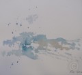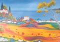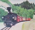 Stampe a colori, di cui una intitolata "Villaggio di mare" e una senza titolo raffigurante un treno in corsa in un paesaggio montano.